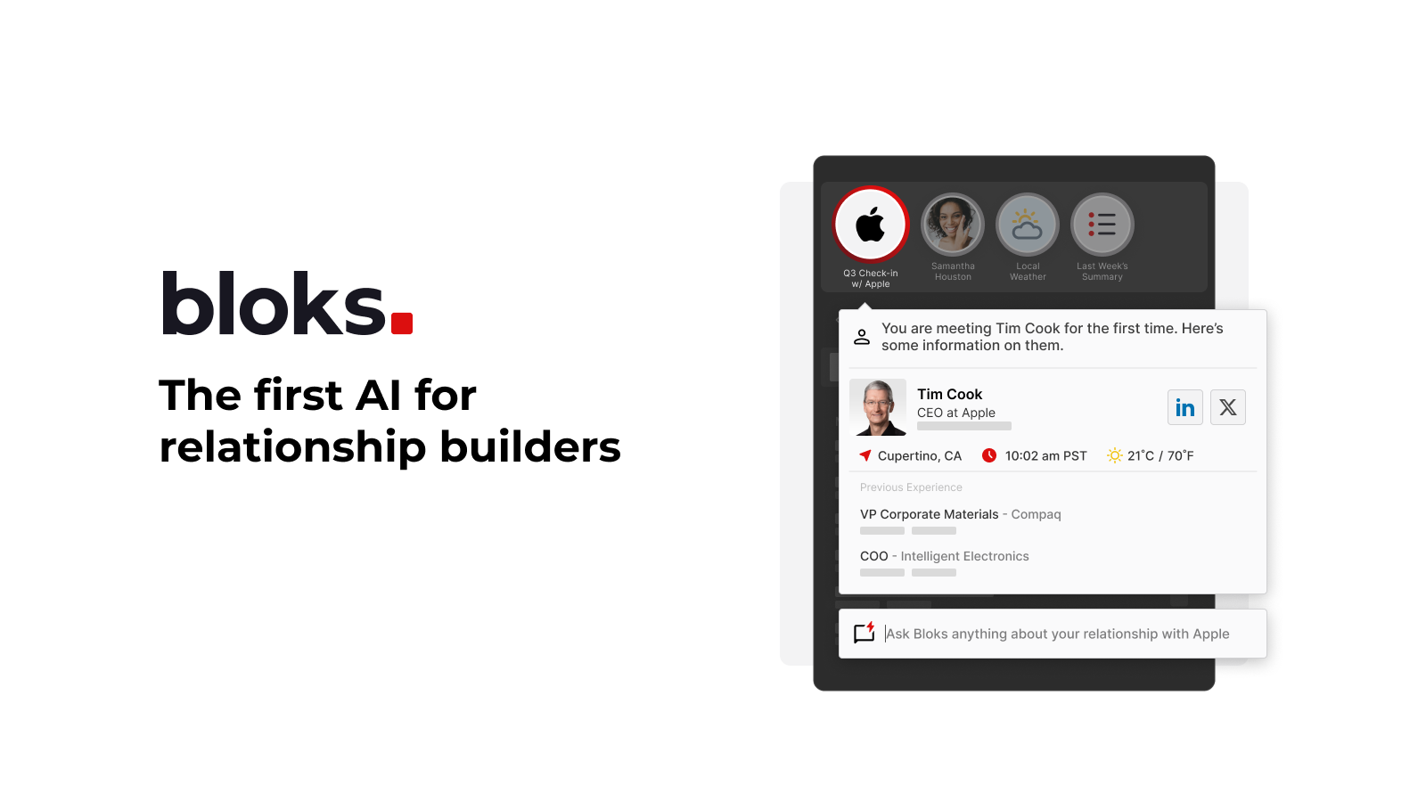 Bloks Briefs will transform the way you build relationships. It marks a significant stride in our evolution to become more than a meeting and productivity assistant but an AI-powered personal CRM that works on your behalf, just like a chief of staff 🫡